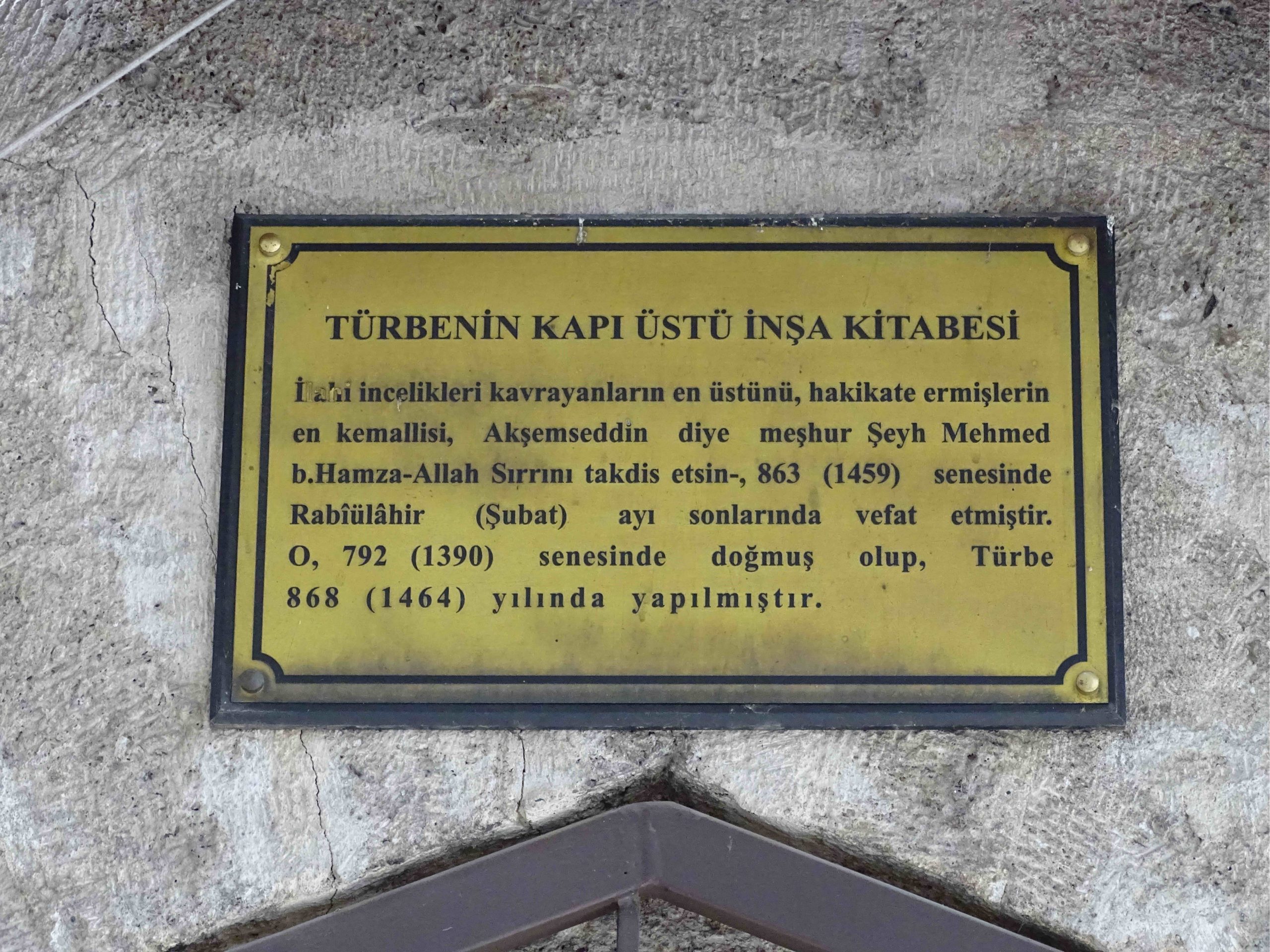 Halifelerin’den Abdürrahim Karahisari’nin 865’te ( 1460-6 1) Mahmud Paşa adına kaleme aldığı Vahdetname’nin başında yer alanbir beytine göre. Akşemseddin’in bu ta-rihten önce vefat etmiş olduğu açıkça anlaşıldığından, Menakıbname’deki vefat tarihinin doğruluğuna hükmedilebilir. Nitekim bugün türbe kapısı üzerinde bulunan inşa kitabesi de 863 Rebiül ahirini göstermekte ve menakıbın verdiği bilgiyi doğrulamaktadır. E. Hakkı Ayverdi’nin kitabedeki “rebiayn” kelimesini “rebiülevvel” olarak kabul etmesinin izahı zordur. Türbesi vefatından beş yıl kadar sonra yapılmış olup sandukası üzerindeki yazı da oğullarından Mehmed Sadullah’a aittir. Evlatlarından Mehmed Sadullah ve Nürullah da bu türbede yatmaktadır. Kaynaklarda aynı zamanda “tabib-i ebdan olduğu , devrinin iyi bir hekimi sıfatıyla da şöhret kazandığı ve tıbba dair eserleri bulunduğu belirtilen Akşemseddin’in, tıp tarihinde ilk defa mikrop meselesini ortaya atmak ve hastalıkların bu yolla bulaştığı fikrini öne sürmekle, bu alanda kesin bilgiler veren Fracastor adlı İtalyan hekimden en az 100 yıl önce bu konuya ilk temas eden tabip olduğu kabul edilmektedir.