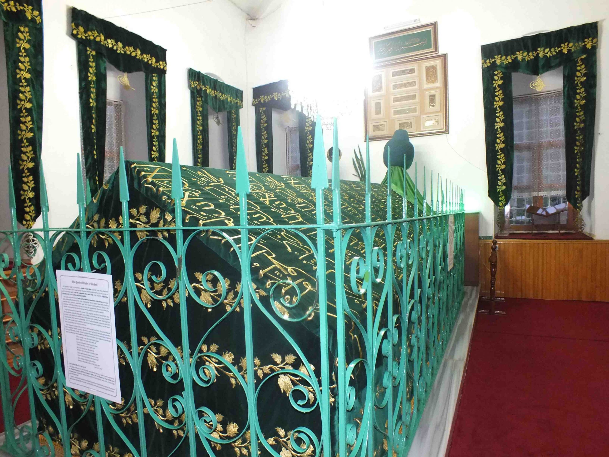 Ünlü hadis alimi Taberani el-Mu’cerrülkebir adlı eserinde Ebu Şeybe el Hudri hazretleri ile Ebu Said el-Hudri hazretlerinin kardeş olduklarını belirtmektedir. Süleymaniye Kütüphanesi, Nuri Arlasez Koleksiyo nu’nda bulunan yazmaya göre, Ebu Şeybe el-Hudrı hazretleri ile Ebu Said el Hudrı hazretleri kardeş olup, aynı sanduka altında medfundur. Türbeye giriş kapısının hazi reye bakan iç yüzünde kapı üstündeki tahtanın üzerinde eğri olarak konulmuş olan kitabede Yesarizade ‘nin hat tı ile “Tevekkel Allah ” (Al lah’a tevekkül et) yazılıdır. Türbenin içerisinde kıble tarafına sonradan bir ahşap mihrap konulmuştur. Duvar larına alelusul yerleştirilmiş bol sayıda sıradan hat ve resim çerçeveleri bulunmaktadır.