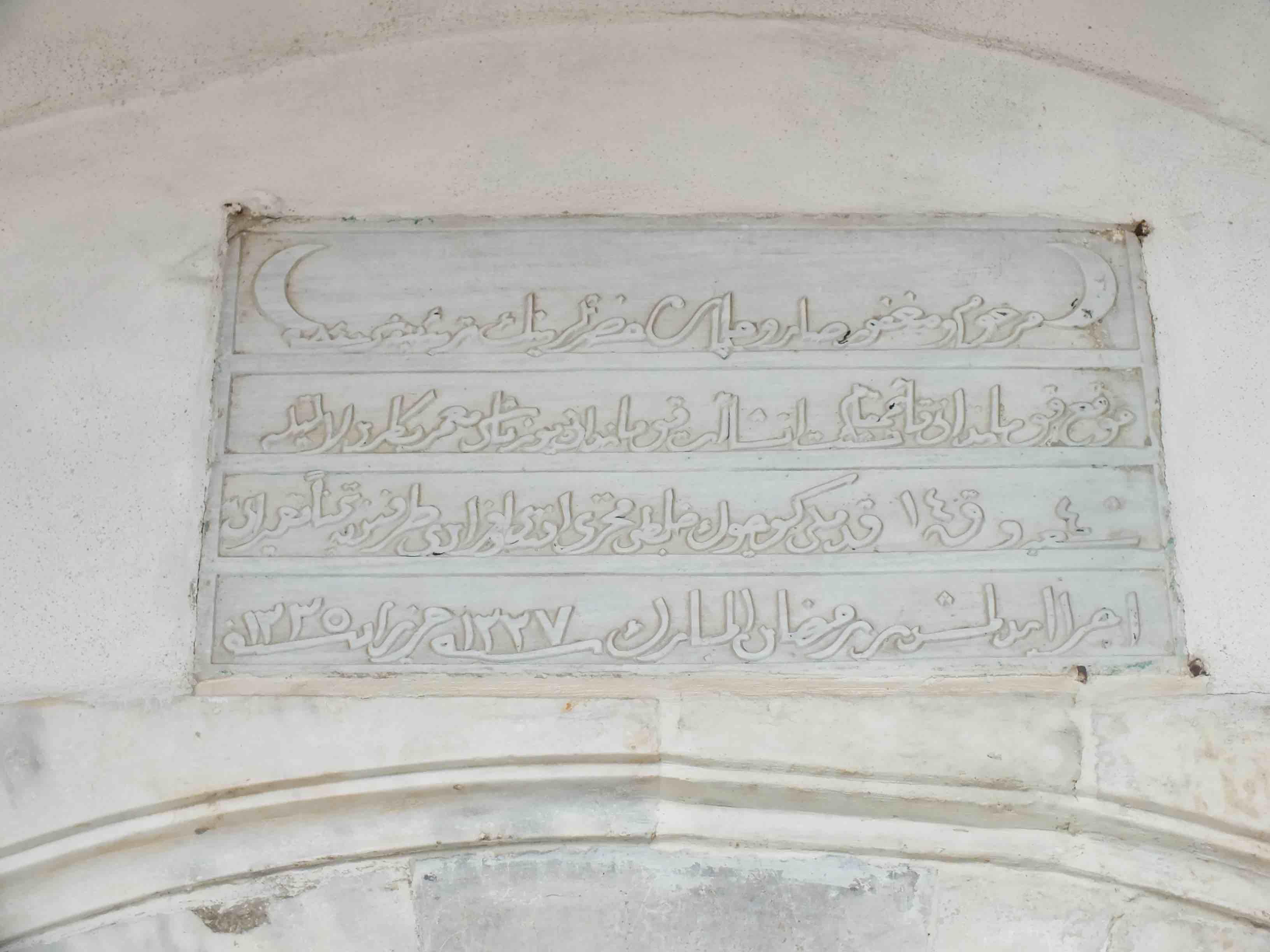Türbe, 1907’de eski imarete ait düzgün kesme taşlar kullanılarak aynı formda yeniden inşa edilmiştir. Duvar yüzeyindeki düzgün kesme taşlar, belirli bir düzene göre değil de gelişi güzel yerleştirilmişlerdir. Beyaz mermer söveli pencere çerçeveleri, düz dövme demir şebekelerle tezyin edilmişlerdir. Kaynaklarda; türbenin orijinalinde, 1907 yılına kadar her yüzeyinde bir penceresinin bulunduğu belirtilmektedir. Ancak 1907 yılında yapılan yenilemede, cephelerde bulunan diğer üç pencere dıştan kesme taş malzeme ile örülerek kapatılmış, içerden de kireç harcı ile sıvanmıştır. Türbenin kuzey cephesinde içeriye geçişi sağlayan eyvan biçimindeki giriş bölümü yer almaktadır. Giriş eyvanının üzeri, türbenin üst örtüsüne uygun olarak, eğimli bir çatı ile örtülüdür. Eyvanın iç duvarlarında, karşılıklı iki oturma sediri vardır. Yine bu sedirlerin üstünde duvar yüzeyinde mermer kaplı kare formda birer niş bulunmaktadır.